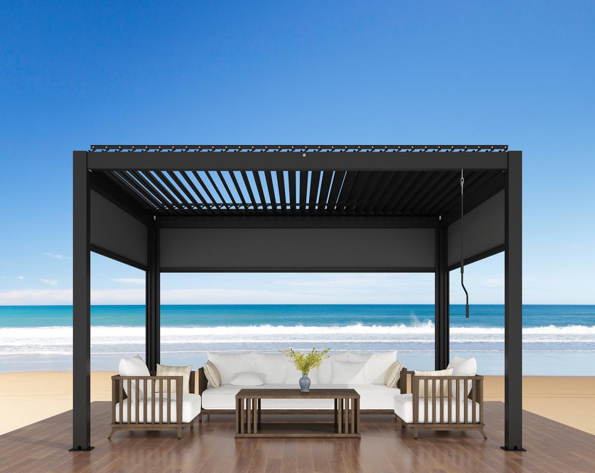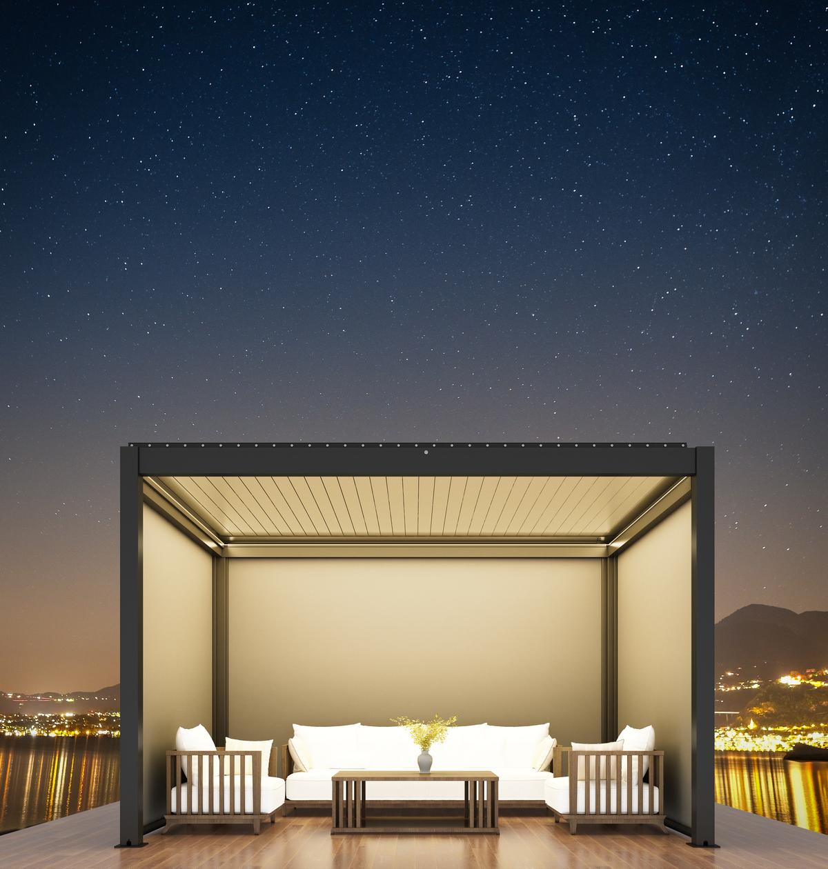 Arredate uno spazio abitativo esterno con il nostro modello 3×4 metri. Nella versione motorizzata, controllate l’apertura delle lamelle e l’illuminazione a LED per il massimo comfort.